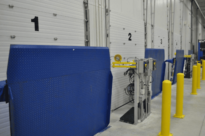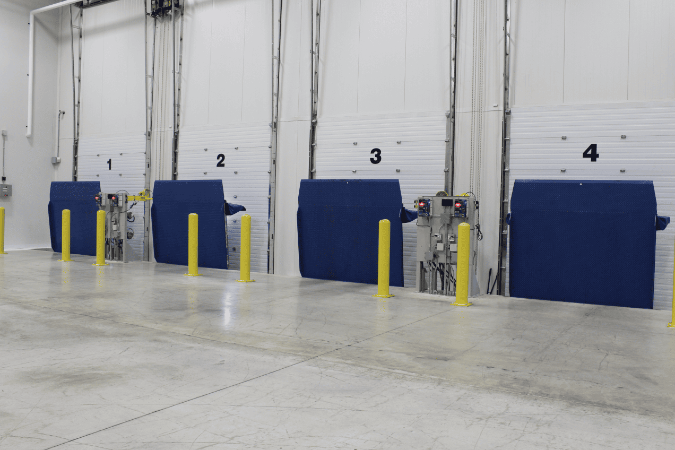 - Les protections anti-écoulement haute visibilité de 3" (76 mm) maintiennent les chariots élévateurs correctement positionnés, avec un accès plus large à l'entrée de la remorque.